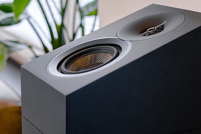 The overall aesthetic is further refined with a sleek cabinet finish, contributing to the speakers’ modern and elegant appearance.