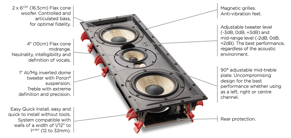 On this in-wall speaker, the mid-treble plate can be rotated by 90° for use as a left, centre or right loudspeaker to aim at the listening spot. The tweeter and mid-levels can be adjusted to adapt to the room acoustics: this will result in the best performances regardless of the environment.
