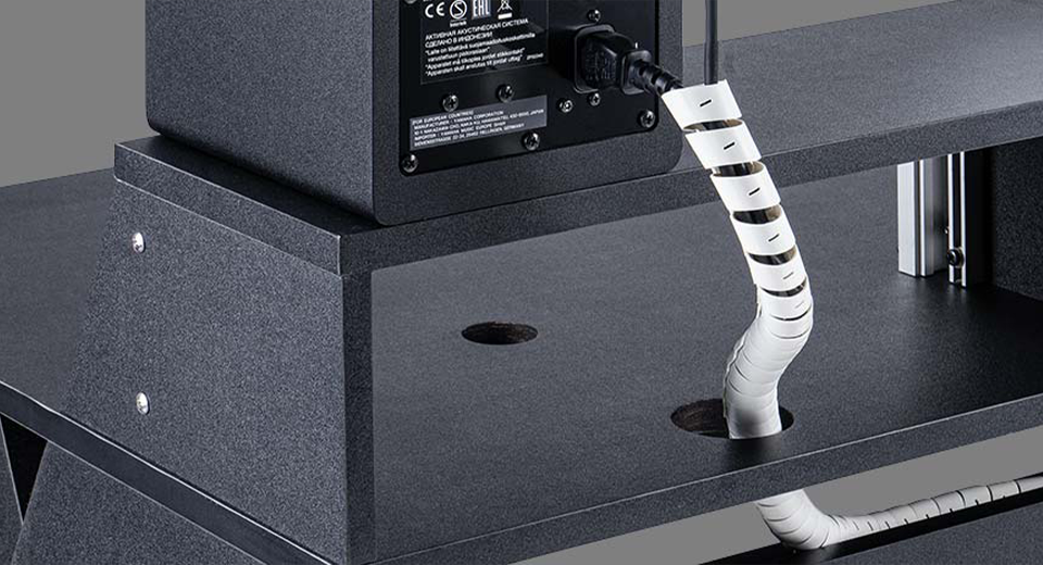 The construction offers many intelligent details, as well as plenty of ducts for cable routing on the top, inside and bottom of the Sound Desk Pro. An interior cable duct is also suitable for organising the power supply using multiple sockets and is accessible from both the front and rear. The cable recess at screen height makes it easy to place the Sound Desk Pro flush with the wall.