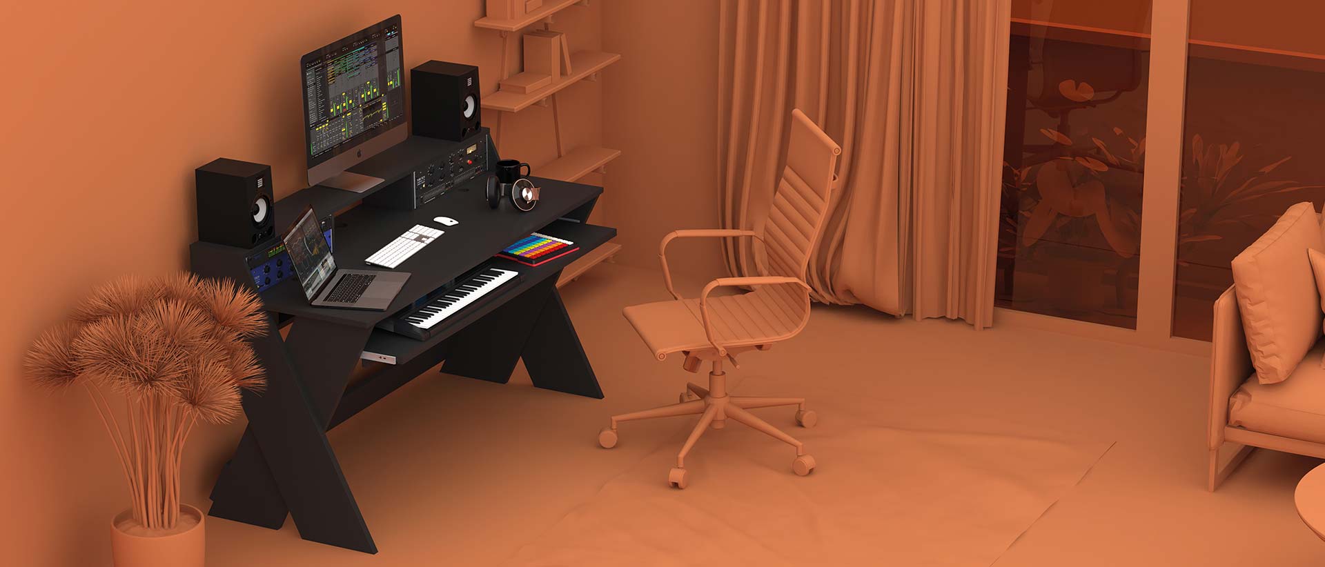 The Glorious Sound Desk Pro is a professional studio workstation, which is suitable for many creative applications and is thoughtfully designed to form the centre of your production process. The studio table offers enough space to set up a laptop/computer, screen, studio monitors, audio interface, 19" rack-mount equipment, MIDI controllers, synths and a master keyboard.