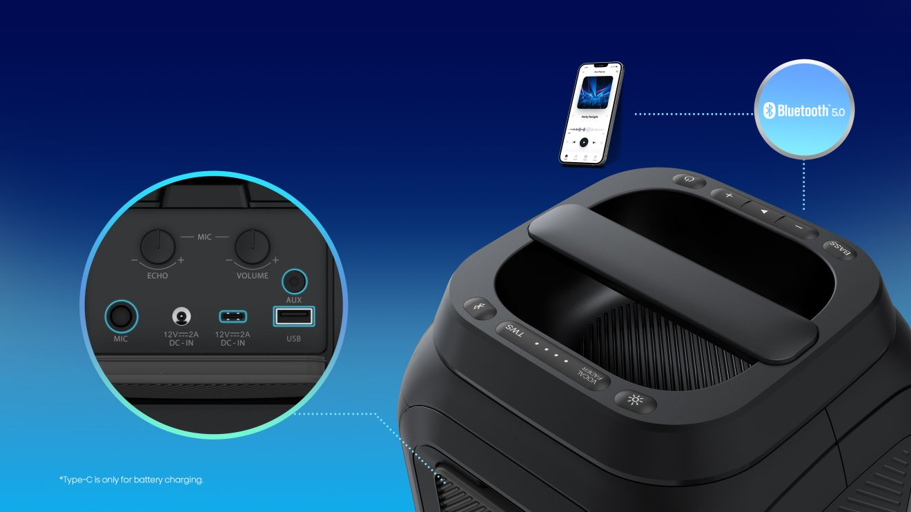 Experience rich, thunderous bass with 2 built-in subwoofers designed for deep audio. Enjoy crystal-clear highs as 2 built-in tweeters deliver sharp, high-pitched tones, creating an unforgettable party atmosphere.