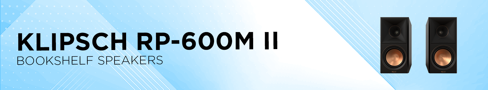 Klipsch RP-600M II Bookshelf SpeakersFrequency Response: 44-25kHz +/- 3dB Sensitivity: 94.5dB @ 2.83V / 1m Power Handling (Cont/Peak): 100W / 400W Nominal Impedance: 8 Ohms Compatible Crossover Frequency: 1500Hz High Frequency Driver: 1" Titanium LTS Vented Tweeter with Hybrid Cross-Section Expanded Tractrix® Horn Low Frequency Driver: 6.5" Cerametallic Cone Woofer with Faraday rings Enclosure Material: MDF (Internally Braced) Enclosure Type: Bass Reflex via rear-firing Tractrix® Port Inputs: Dual aluminum binding posts / bi-wire / bi-amp Height: 15.75" (40.0 cm) Width: 7.95" (20.2 cm) Depth: 13.00" (33.0 cm) Product Weight: 8.1lb (8.20kg) Finish: Ebony, Walnut