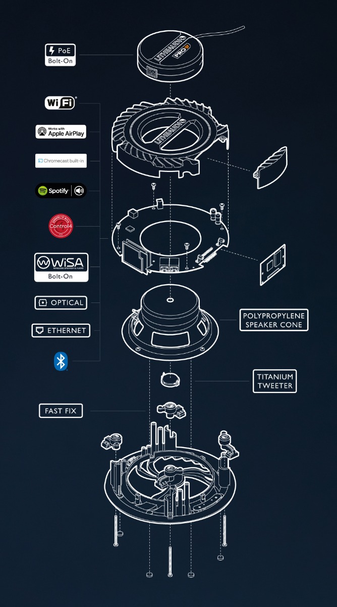 Designed explicitly to be top of the Lithe Audio integrated speaker range. This award-winning in-ceiling active offering delivers many leading features, including the optional bolt-ons for WiSA integration for Dolby Atmos systems, PoE power delivery for the convenience of easy installation and the most comprehensive set of wireless & wired connectivity options.