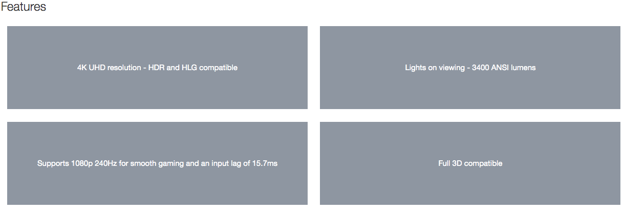 | Features | Specification Display/image Display technology DLP Resolution UHD (3840x2160) Brightness 3,400 lumens Contrast ratio 500,000:1 Native aspect ratio 16:9 Aspect ratio - compatible 4:3 Keystone correction - vertical +/-40° Horizontal scan rate 31 ~ 135Khz Vertical scan rate 24 ~ 120Hz Uniformity 80% Screen size 0.84m ~ 7.62m (33" ~ 300") diagonal Lamp info Light source type Lamp Lamp watts 240 Lamp life hours (up to) 4000 (Bright), 15000 (Dynamic), 10000 (Eco) Optical Throw ratio 1.5:1 ~ 1.66:1 Projection distance (m) 1.21m - 9.9m Zoom 1.1 Zoom type Manual Focal length (mm) 15.84 ~ 17.42 Lens shift Vertical +0% Native offset 105% Connectivity Connections