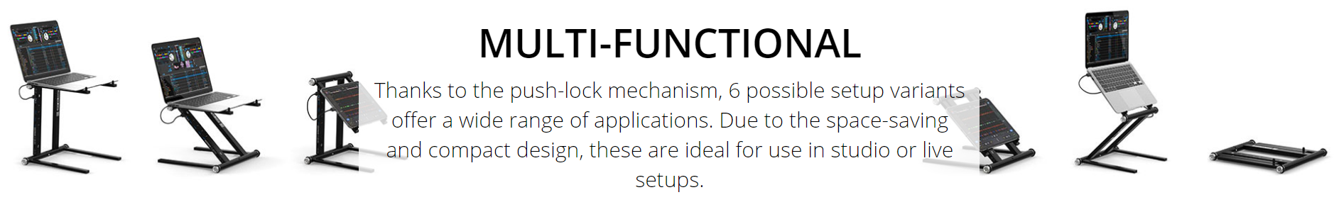 Designed for DJ and studio setups to optimize your workspace. Space-saving, collapsible and lightweight construction. Swift and tool-free assembly thanks to an easy push-lock mechanism. Soft foam pads to protect your devices and non-slip rubber base for stability. Suitable for all common laptop sizes (11''-18''), tablets, controllers and more.