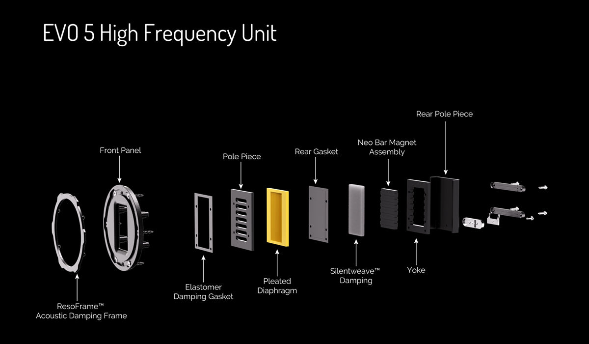All five EVO 5 models incorporate a new, improved version of the AMT (Air Motion Transformer) high-frequency unit developed for the EVO 4 range. Compared to conventional dome tweeters, Wharfedale’s AMT drivers deliver lower distortion and superior speed and accuracy.